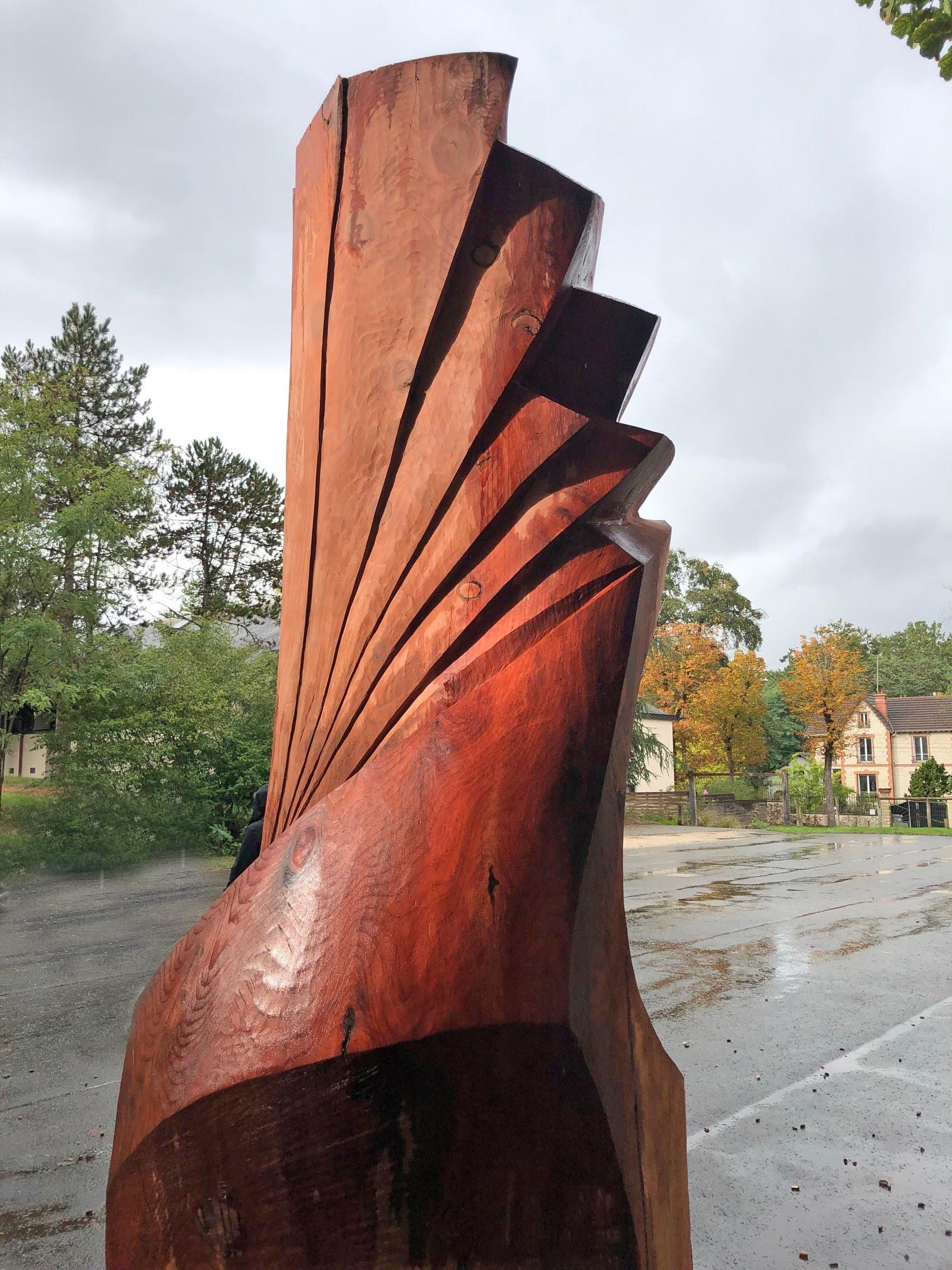 Le séquoia a été travaillé patiemment tout l’été et révèle des formes et des couleurs magnifiques. Le choix de l’abstraction laisse libre cours à l’interprétation de chacun. C’est ainsi que les enfants de l’école élémentaire de Samois, rassemblés vendredi 23 septembre y ont vu un trône, un rocher, une cascade, une main, un éventail ou encore une ville ou tout simplement la nature !