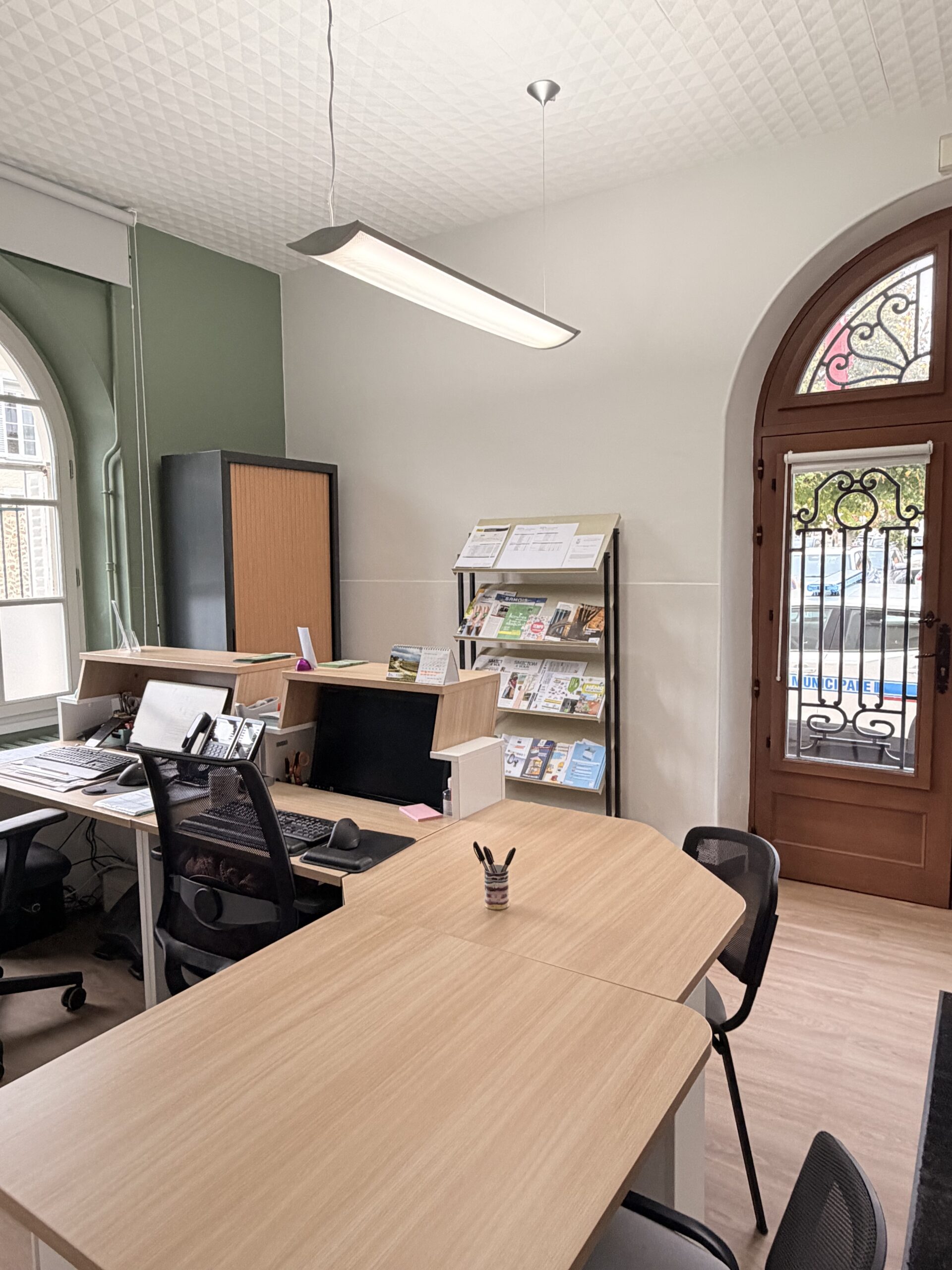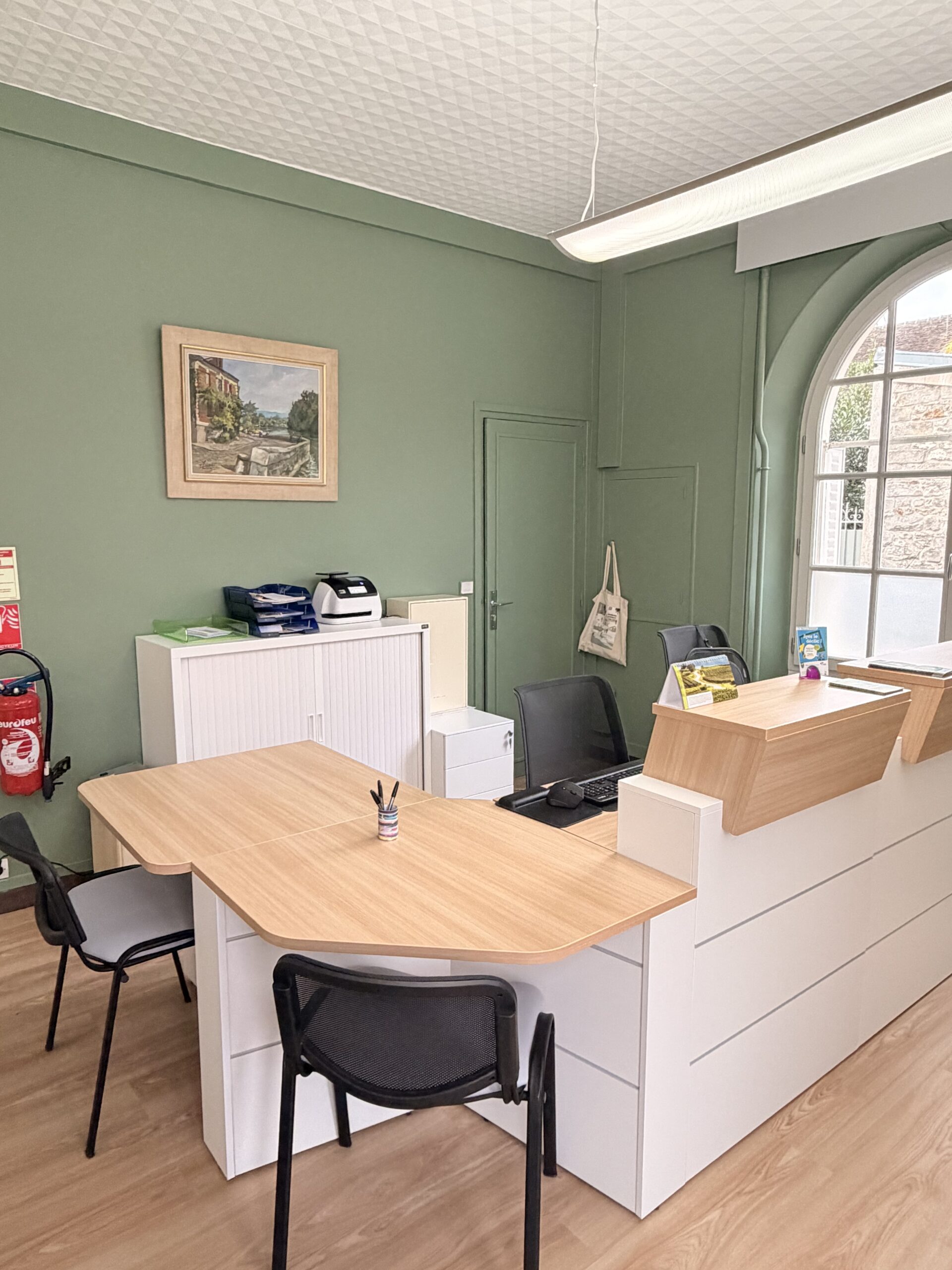 Ceux qui nous ont rendu visite au mois d’août le savent, pendant près d’un mois l’accueil de la mairie s’est fait côté square, par la salle des mariages. Pendant ce temps l’entrée habituelle profitait d’une réfection. Des travaux nécessaires qui avaient pour objectif d’offrir un espace plus fonctionnel et adapté à l’accueil du public. Les murs abîmés ont été repris et repeints dans des tons vert sauge et blanc, un choix à la fois moderne et apaisant, en harmonie avec l’environnement naturel de la commune. Une borne d’accueil vient également remplacer les anciens bureaux pour compléter cet espace qui devient à la fois pratique et moderne.