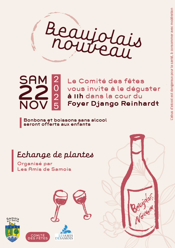 Le Comité des fêtes de Samois-sur-Seine vous invite à déguster le Beaujolais nouveau samedi 22 novembre à 11h dans la cour du foyer Django Reinhardt