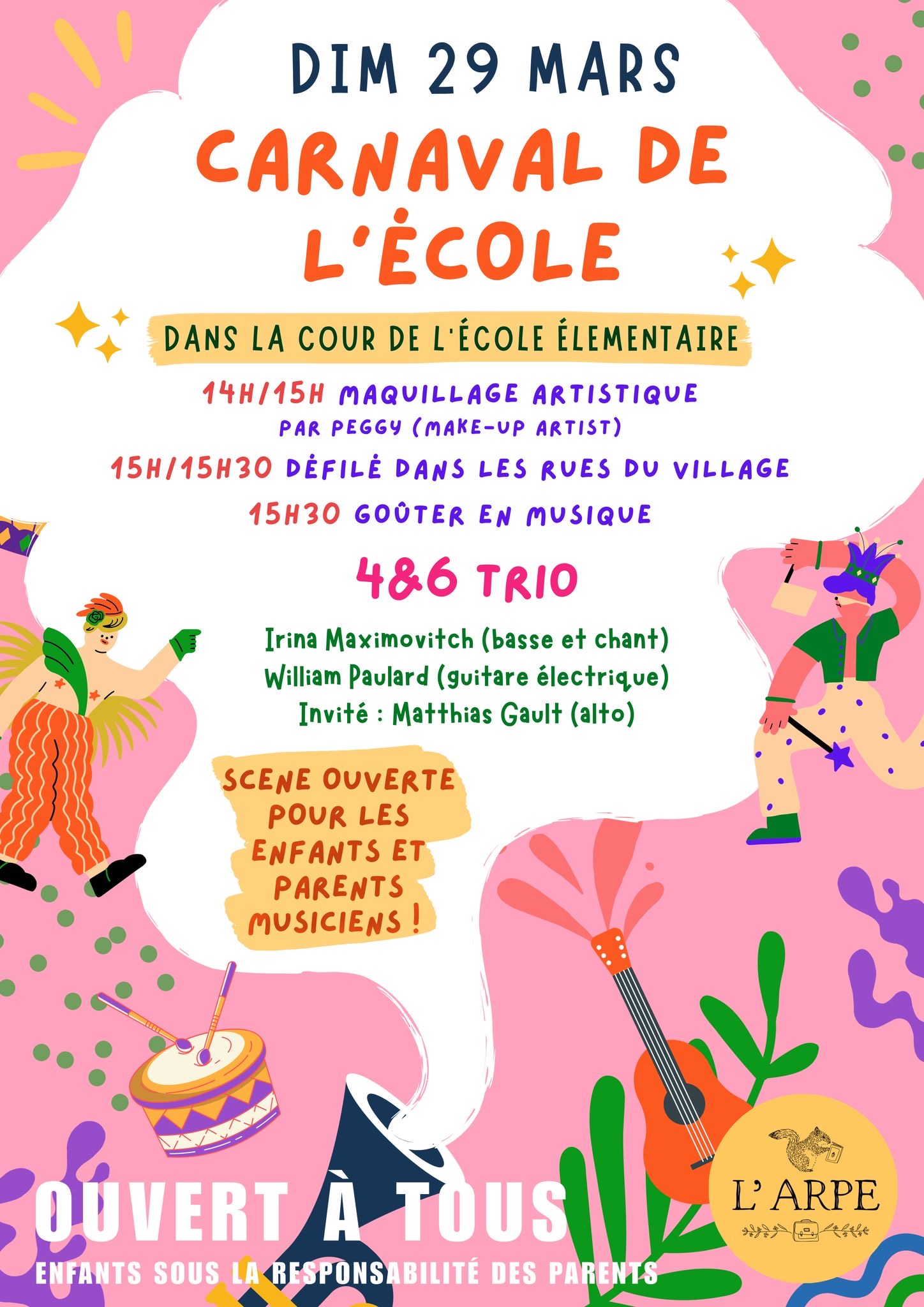 Un événement ouvert à tous qui se déroulera dans la cour de l’école. L’ARPe vous attend nombreux pour partager ce moment musical et haut en couleurs ! N’hésitez pas à venir déguisés !