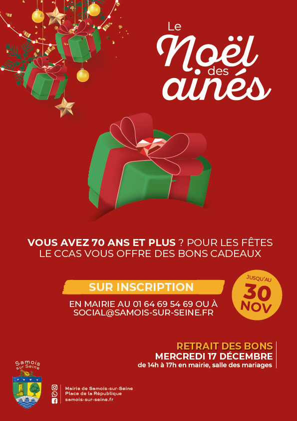 Le Centre Communal d’Action Sociale (CCAS) prépare le Noël des aînés ! Les inscriptions sont ouvertes jusqu’au 30 novembre pour les samoisiens âgés de 70 ans et plus. Cette année, le CCAS vous offre des bons cadeaux à valoir chez les commerçants samoisiens. Une belle manière de soutenir le commerce local tout en se faisant plaisir. Le retrait des bons aura lieu le 17 décembre de 14h à 17h en salle des mariages. Un moment convivial vous attend autour d’une boisson chaude et d’une petite collation !