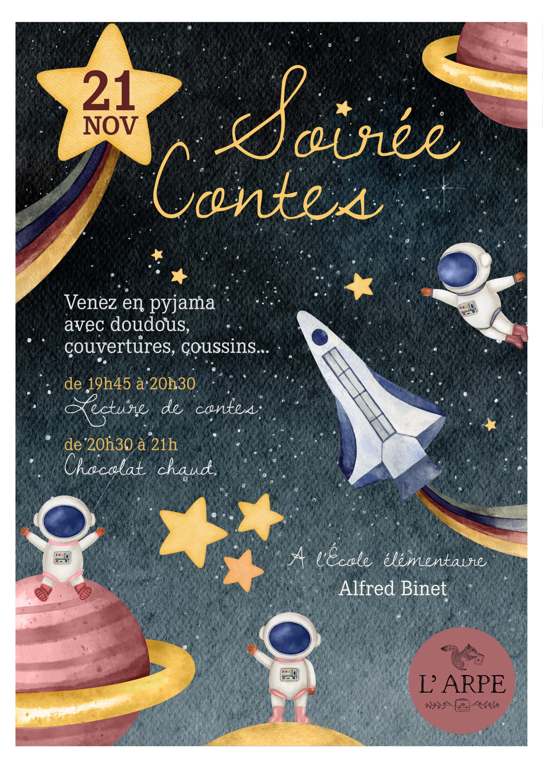 Vendredi 21 novembre, l’ARPE vous propose une soirée contes sur le thème de la Forêt. Rendez-vous à 19 h 45 en pyjama avec vos doudous couvertures et coussin à l’école élémentaire !