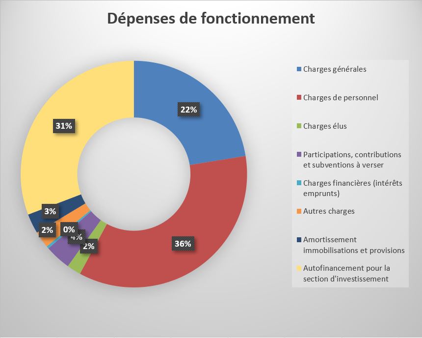 La répartition par nature en dépenses, de cette enveloppe se décline essentiellement en trois domaines : les frais de personnel, les charges à caractère général et l’autofinancement affecté aux investissements.