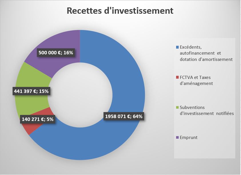 Ces projets seront financés à hauteur de 64% par les ressources propres internes (excédents, autofinancement de la section de fonctionnement et dotation d’amortissement), à hauteur de 20% par des ressources propres externes (fond de compensation de la TVA, taxes d’aménagement et subventions d’investissement notifiées) et le complément soit 16% par recours à l’emprunt.