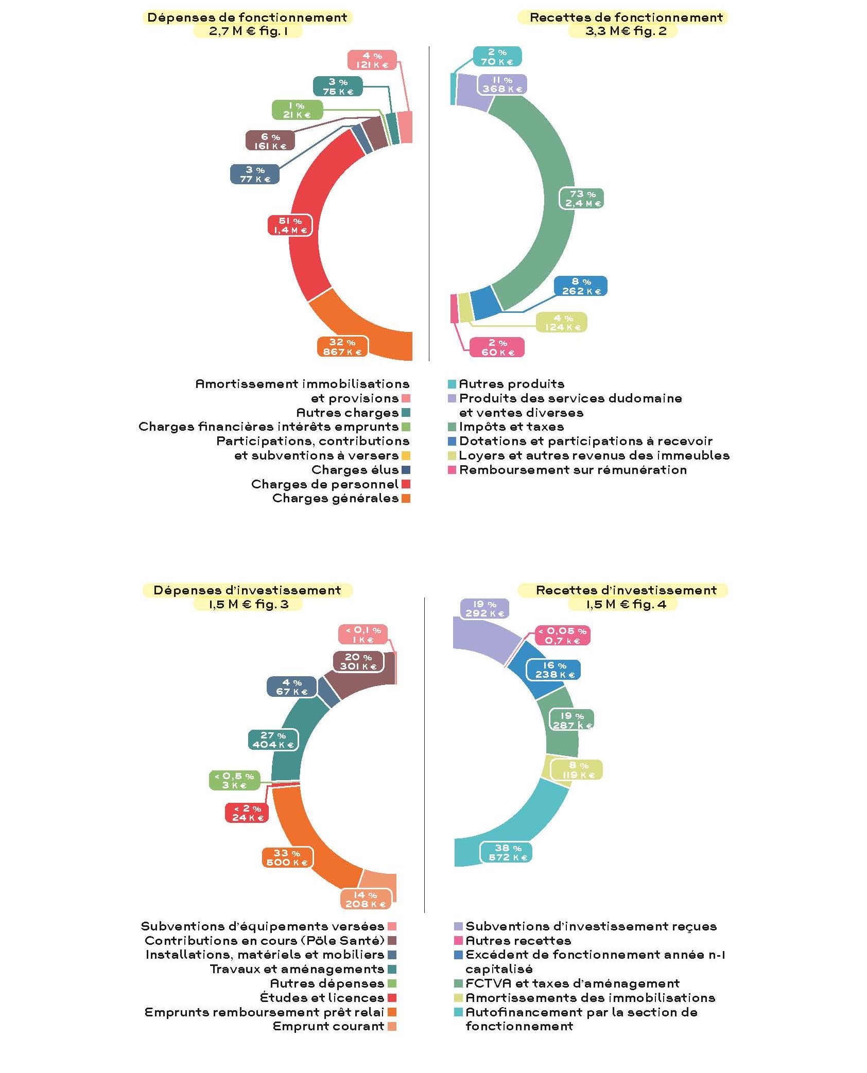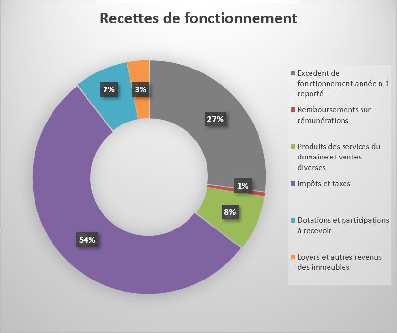 En recettes, les impôts demeurent la source première des ressources de la commune (plus de la moitié).